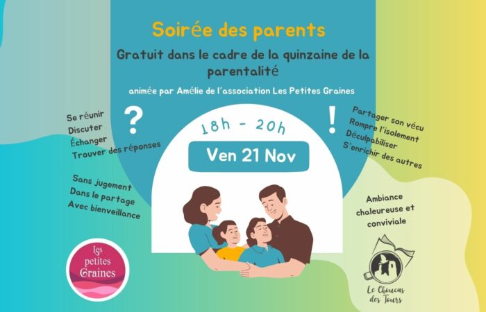 Les soirées des parents du Choucas sont des moments de partage entre parents d’enfants de tous les âges dans une ambiance chaleureuse et conviviale au Choucas des Tours. Elles seront animées par Amélie de l’Association Les Petites Graines, une association de soutien à la parentalité et d’encouragement à l’éducation bien-traitante, qui s’adresse à toute personne en contact avec des enfants : parents, futurs parents, grands-parents… mais aussi adultes intervenants auprès des enfants et des adolescents (assistantes maternelles, personnel de crèches, enseignants, orthophonistes, psychologues…).